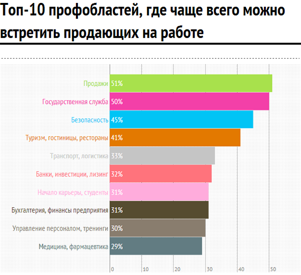 22% таких торговцев предлагают свою продукцию коллегам на регулярной основе. Чаще всего таким образом продают косметику, бытовую технику, одежду, а также различного рода услуги, начиная с ремонта компьютеров и заканчивая изготовлением тортов. При этом около 42% россиян уже приобретали что-нибудь на рабочем месте.