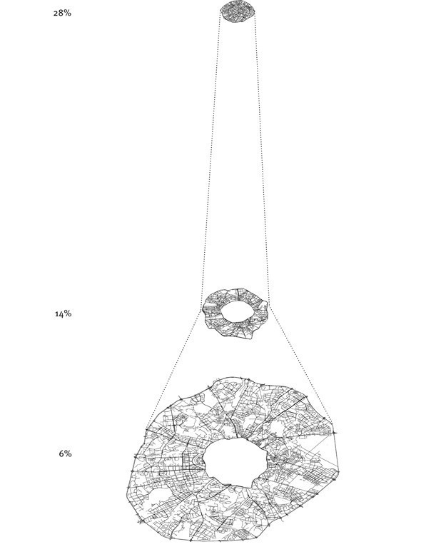 Площадь всех дорог, включая пешеходные отрезки, составляет около 25% от всей территории центра. Причем новые дороги здесь уже не появятся — это так называемый окаменевший участок, «монумент». На окраинах же улиц в четыре раза меньше, всего 6% от площади. Исследователи высчитали, что необходимая плотность дорог для всей Москвы составляет 20% — эта цифра соответствует европейским стандартам и позволит качественно изменить городское пространство.