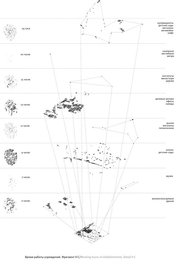 Студенты составили карту наиболее посещаемых и доступных мест города, таких как гипермаркеты, круглосуточные детские сады и спортивные центры. Она демонстрирует возникновение и миграцию новых центров притяжения. На карте также проявляются малоиспользуемые и просто заброшенные участки, которые потенциально могут быть превращены в так необходимые городу публичные пространства.